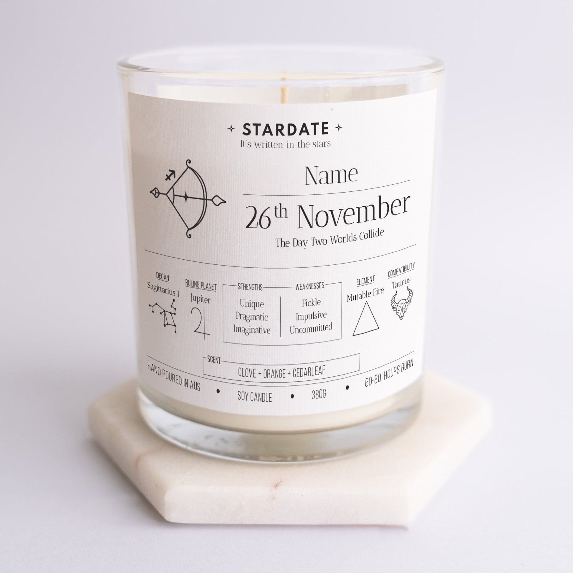 Love Love Stardate candles ive been buying them for all my friends as birthday gifts, getting to personalise with their name is my favourite part about the whole experience. I gifted my friend Evie a candle changed the scent to her liking and she absolutely love her candle. highly highly recommend :)
