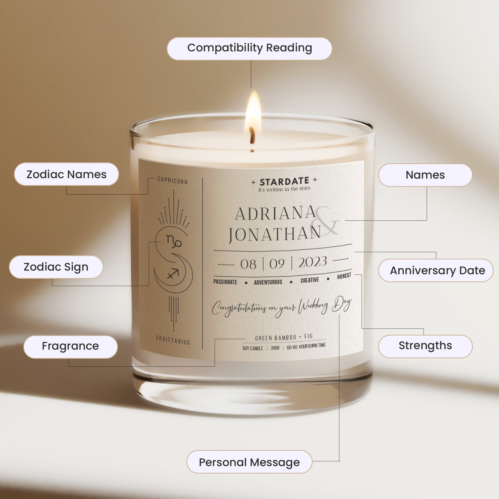 Let the warm glow of these personalised candles guide you on a journey of love and connection. Crafted to shine a light on the depths of your affection, these candles are more than just wax and wick – they are cosmic storytellers. By weaving together the unique threads of your zodiac birthdays, our candles illuminate the profound strengths that define your relationship.