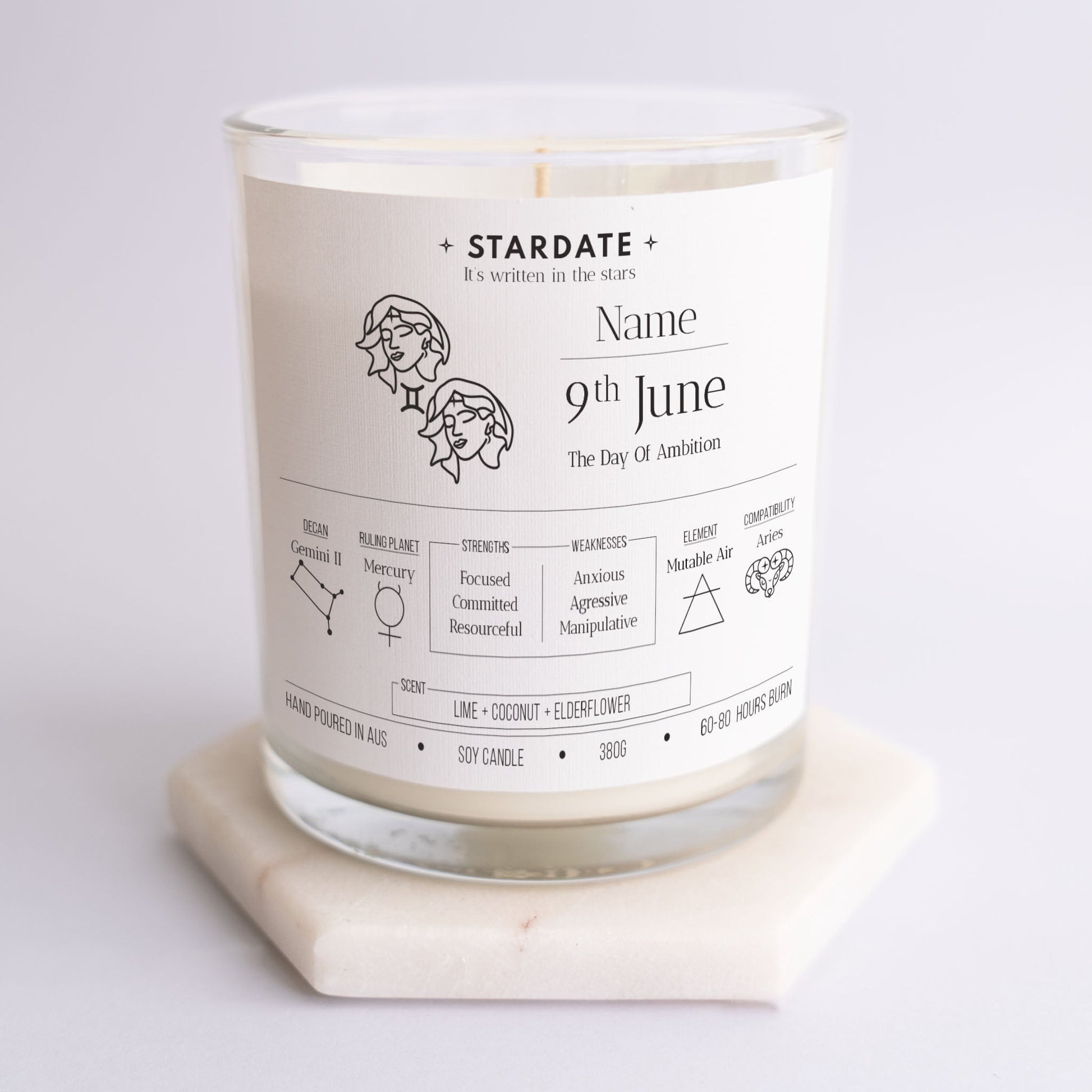 Love Love Stardate candles ive been buying them for all my friends as birthday gifts, getting to personalise with their name is my favourite part about the whole experience. I gifted my friend Evie a candle changed the scent to her liking and she absolutely love her candle. highly highly recommend :)