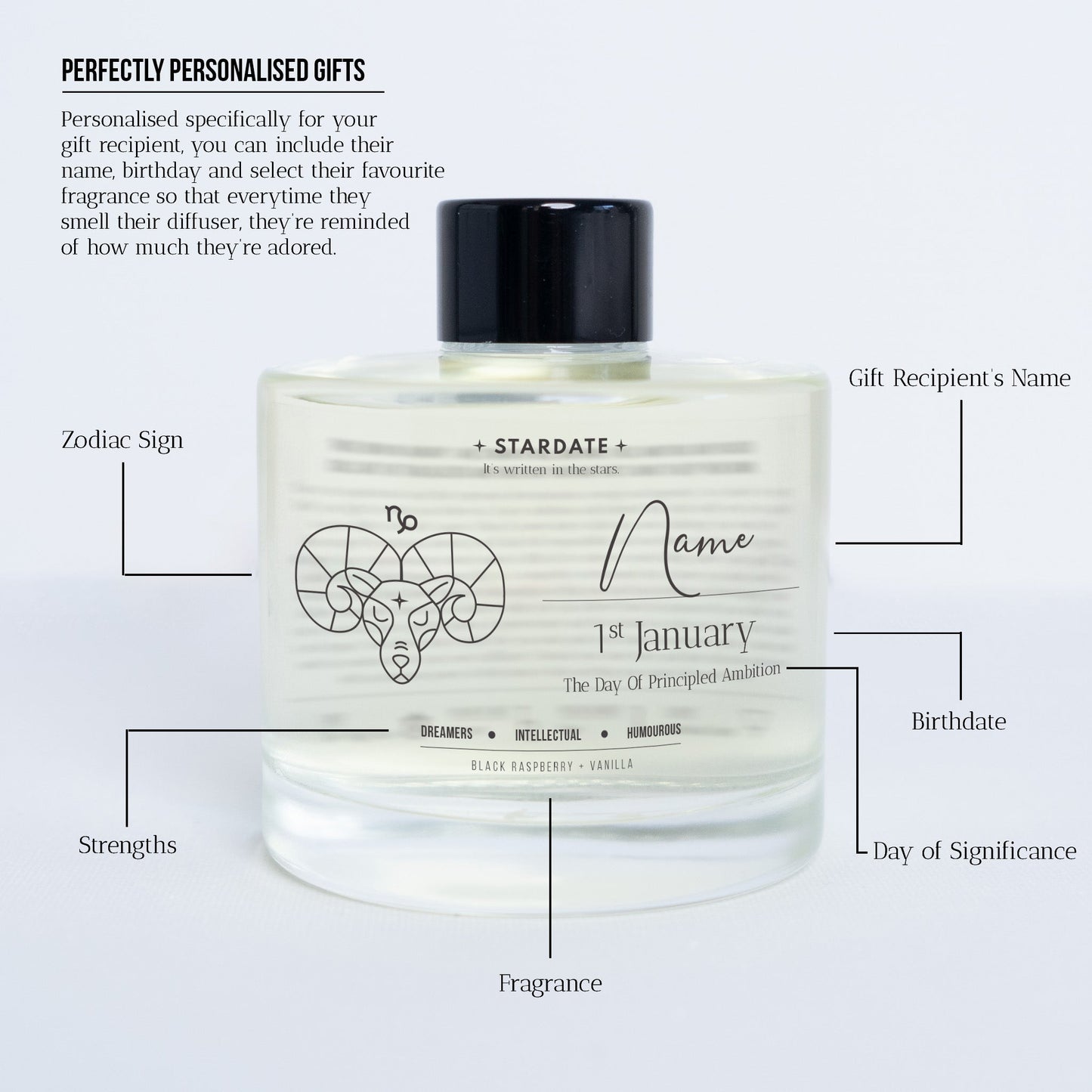 Step into the enchanting world of Stardate Reed Diffusers, where giving becomes a truly magical experience! Infuse your loved one's space with this March 9th | Pisces zodiac-inspired fragrance in a 200mL glass vessel. Personalised with their name, birthdate, zodiac sign and a unique astrological reading specifically for their birthday, these reed diffusers make every occasion memorable, one celestial scent at a time.