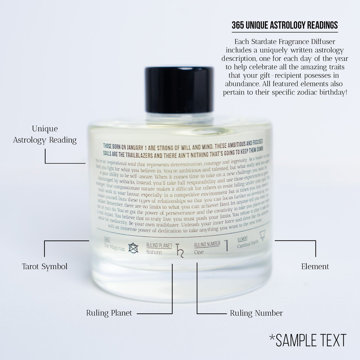 What sets us apart? It's not just the delightful aromas that dance through the air, but the personal touch we bring to each diffuser. Imagine the joy on your loved one's face when they see their name, birthday, and a unique astrological reading on their very own Stardate Reed Diffuser.